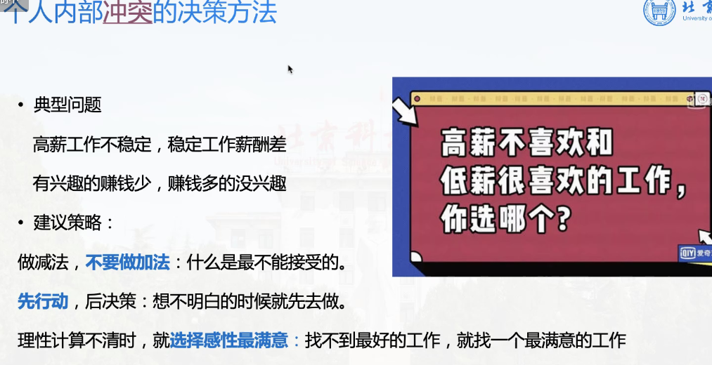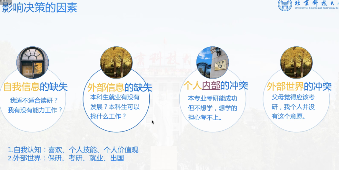 本次指导会的讲解从以下几个方面进行:决策因素,自我认知和外部世界的影响以及个人冲突和就业形势,并且在最后进行了长达了半个小时的答疑解惑时间。
