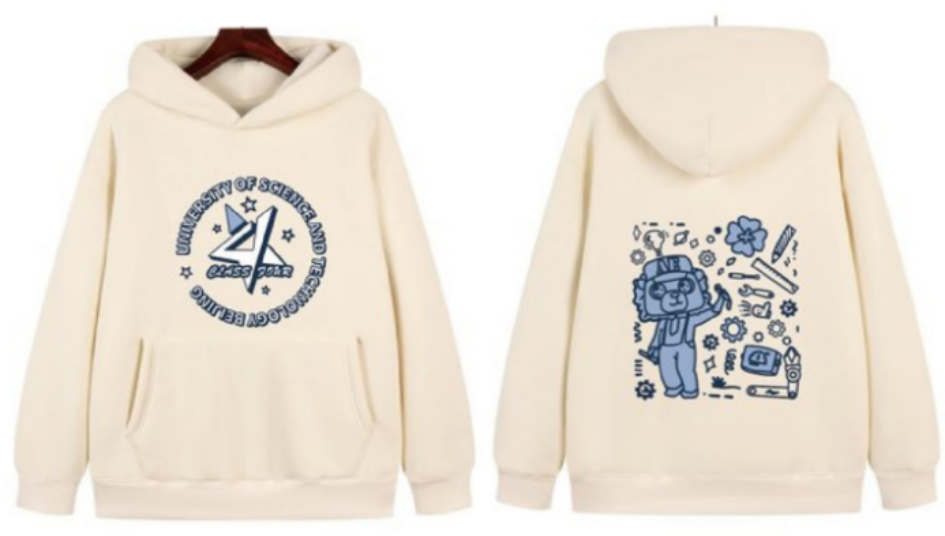 2305班作为本次大赛的冠军,更是设计的独具匠心。以米白色为班服主色,正面班徽主体为一只蓬松可爱的小狮子,背面是的爱心由沙导、小班和班级每位同学的卡通形象组成,这象征着五班同学在沙导和小班的带领下,将心凝聚在一起,聚是一颗心,散是满天星。