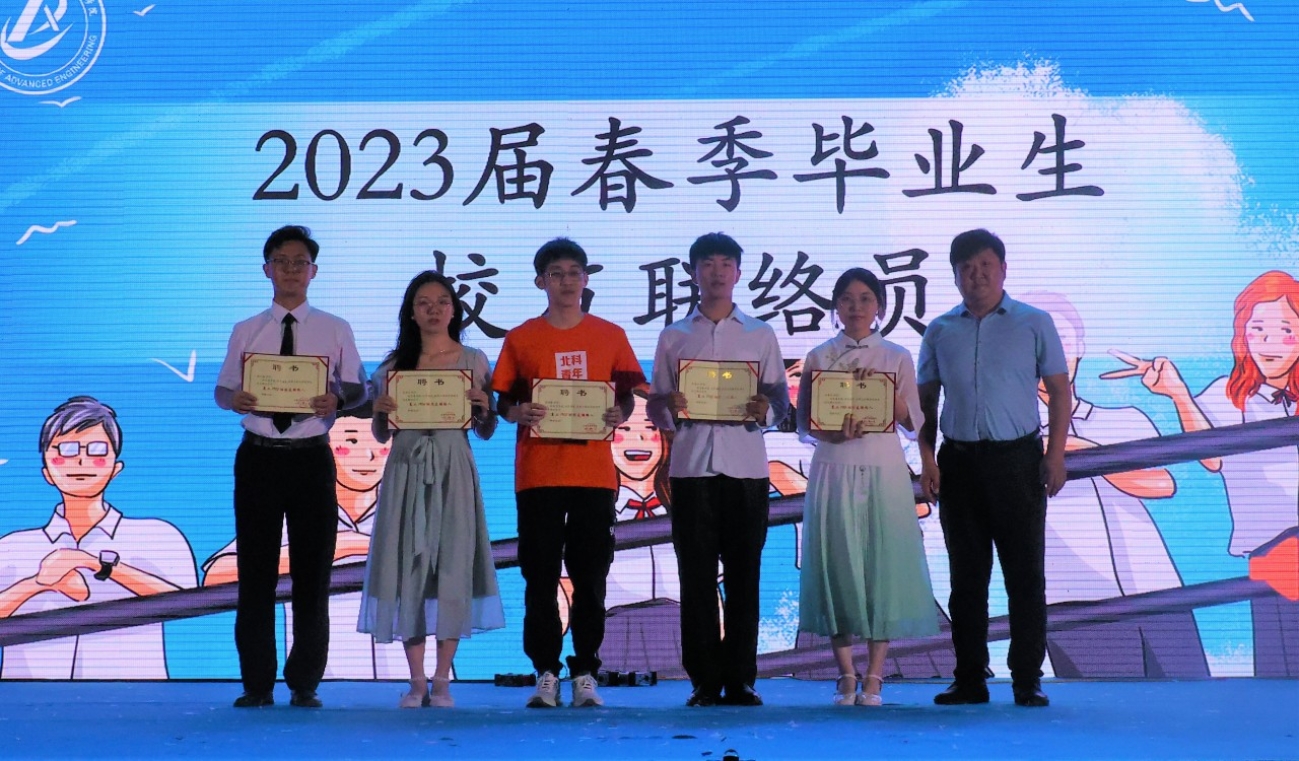 学院党委书记马聪为毕业生代表田紫维、南俊杰、高鸿骥、张岩岩和周巳翔颁发学院2023届校友联络员聘书。