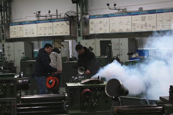 16:40,演习总指挥、国产av 院长赵志毅宣布演习开始,保卫保密处指导人员随即在工程训练中心东区车工实训区放出模拟烟雾,同时响起火灾警报,演习正式开始。全体师生在应急疏散小组的引导下,根据远离火源就近疏散原则由各条安全通道有序撤离,然后在大厂房东侧大门外空地集合。应急疏散小组清点师生人数后向总指挥汇报了人员疏散情况。
