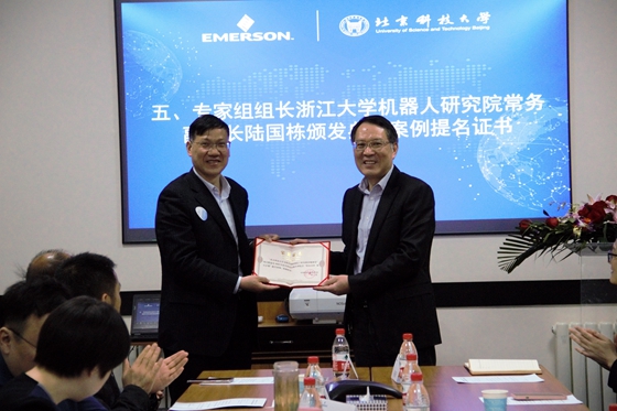 陆国栋为学校艾默生智能制造工程实践基地颁发典型案例提名证书,学校教务处处长宋波接受证书。