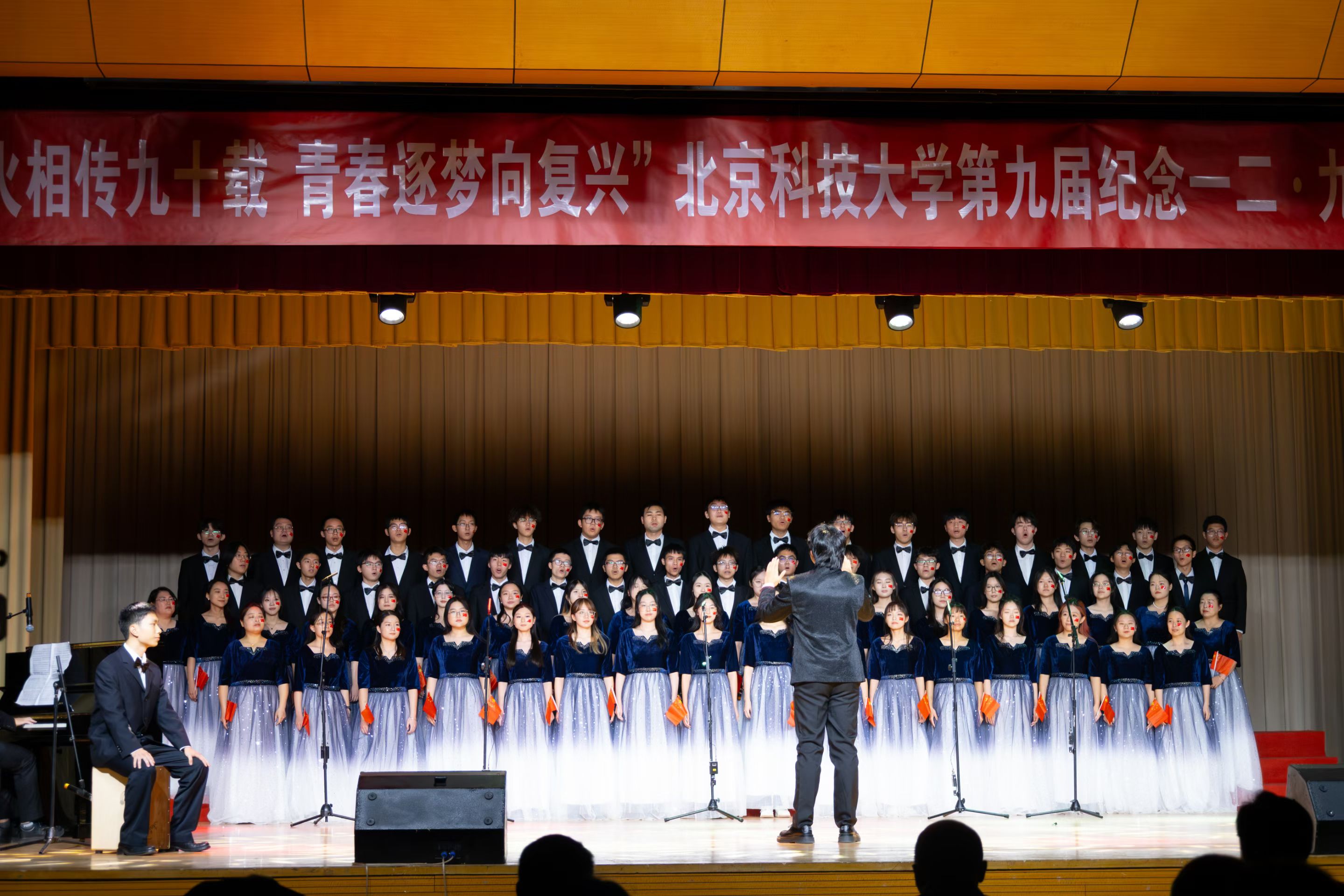 比赛当日,灯光璀璨,气氛热烈。高工师生统一着装,精神饱满。演出别出心裁地以稚嫩纯净的童声朗诵开篇,寓意着革命薪火的代代相传。随后,悠扬的钢琴声与律动的箱鼓声交织,领唱深情诉说,合唱气势如虹,伴舞翩翩起舞。师生们通过《明天会更好》这首经典曲目,不仅呼应了“一二・九”先辈的爱国初心,更唱出了新时代青年对民族复兴的美好祝愿,赢得了评委和观众的一致好评。