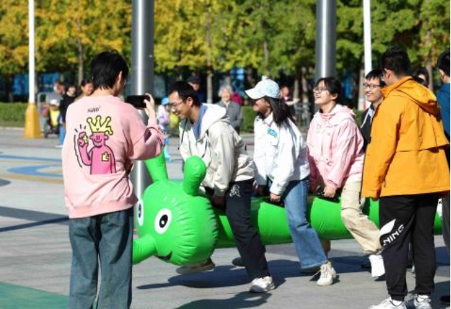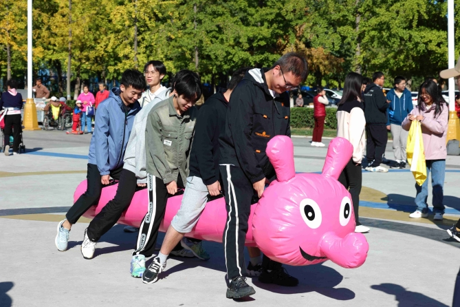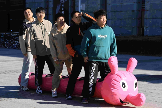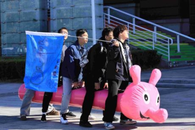 在组长的带领下,各小组纷纷展示了自己精心设计的队旗、队名和口号,展现出了卓越的团队凝聚力和创意精神。在竞速毛毛虫项目中,同学们齐心协力,共同驾驭着充气毛毛虫在跑道上奋勇前行。