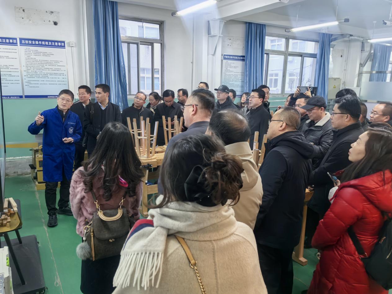 在金工实习基地的激光加工实训室和木工实训室,李芳芳和崔新男两位老师向各位来宾介绍了激光切割、激光打孔、打标雕刻、木料锯切、开榫等先进技术,交流了相关课程设置和开课情况。