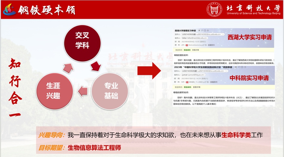 面向岗位需求,刘鹏制定了三步走的发展规划,本科阶段,立足专业基础知识,通过竞赛和科研,探索计算生物前沿领域,在大三下学期计划保研到相关的计算生物学科研院所,并在大四时期寻找一份计算生物学相关实习。硕士期间,将计划以生物学问题为导向,以人工智能技术为依托,并期望在毕业时能够成为一名满足目标岗位需求,服务国家重大战略的优秀的生物信息算法工程师。