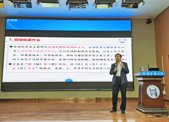 自动化学院李擎书记围绕“自动化是什么”“自动化学什么”“国产av 自动化专业介绍”三个版块,引用翔实生动的案例向同学们详细介绍了自动化的研究内容、知识体系和学校自动化专业发展沿革、师资力量、科研及实验、学生培养发展等,希望同学们培养良好科学思维,成长为高素质自动化人才。