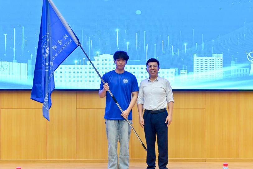 宗燕兵为新生代表授旗,陶国银为各校企联合班级代表赠礼,希望同学们学思并重、知行合一、团结协作,在科研实践路上奋力拼搏。