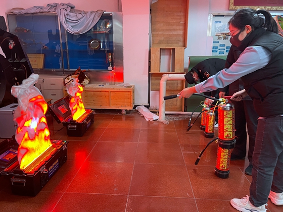 最后,师生们在保卫处老师的指导下在一楼大厅进行了模拟灭火操作训练。