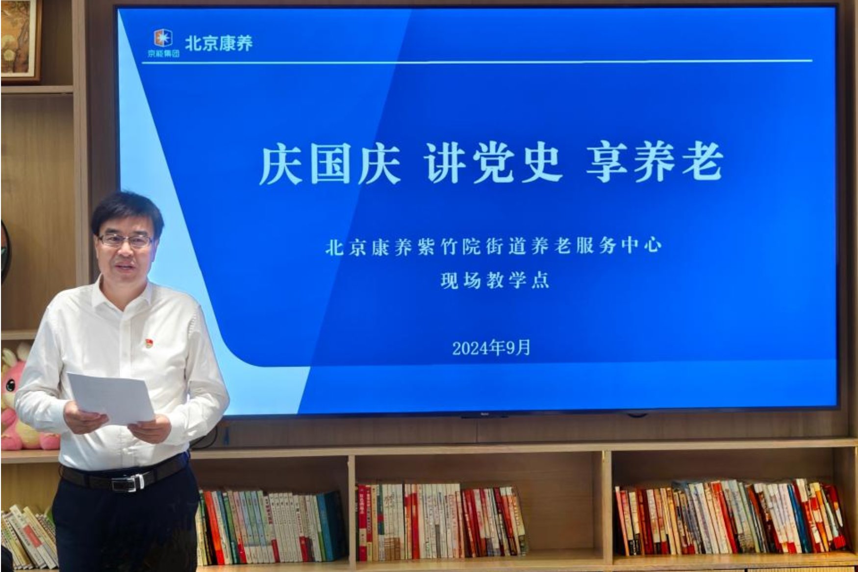 值此中华人民共和国成立75周年之际,为深入贯彻党的二十届三中全会精神,传承和弘扬爱国主义精神,9月30日,国产av 国产av 2023级党支部联合京能集团所属北京康养老年福党支部,在北京康养紫竹院街道养老服务中心特别策划开展了“庆国庆 讲党史 享养老”现场教学点活动,共上一堂党课。